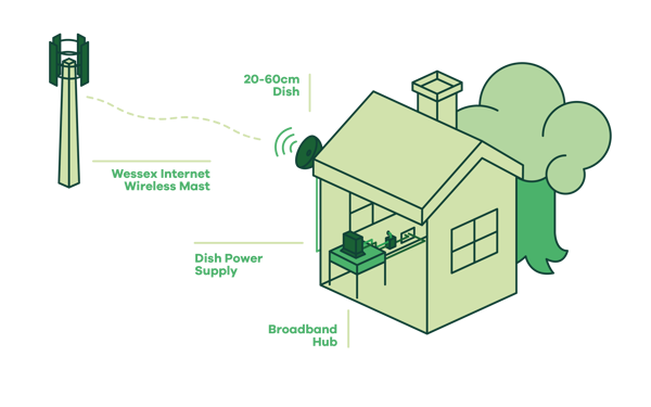 If we can see your property from one of our masts, with no buildings, trees or hills in the way to block the signal, it means you can get superfast broadband with download speeds of up to 50Mbps wirelessly. All we’d need to do is install a small dish (no bigger than a satellite TV dish) on your house to pick up the signal.